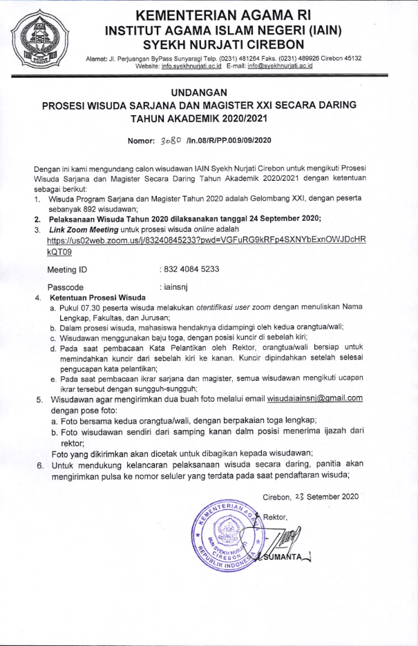 Undangan Wisuda Sarjana dan Magister Secara Daring Tahun 2020 23 September 2020 arifin Pengumuman 0 UNDANGAN PROSESI WISUDA ONLINE09232020104951 iain cirebonwisuda daring iain