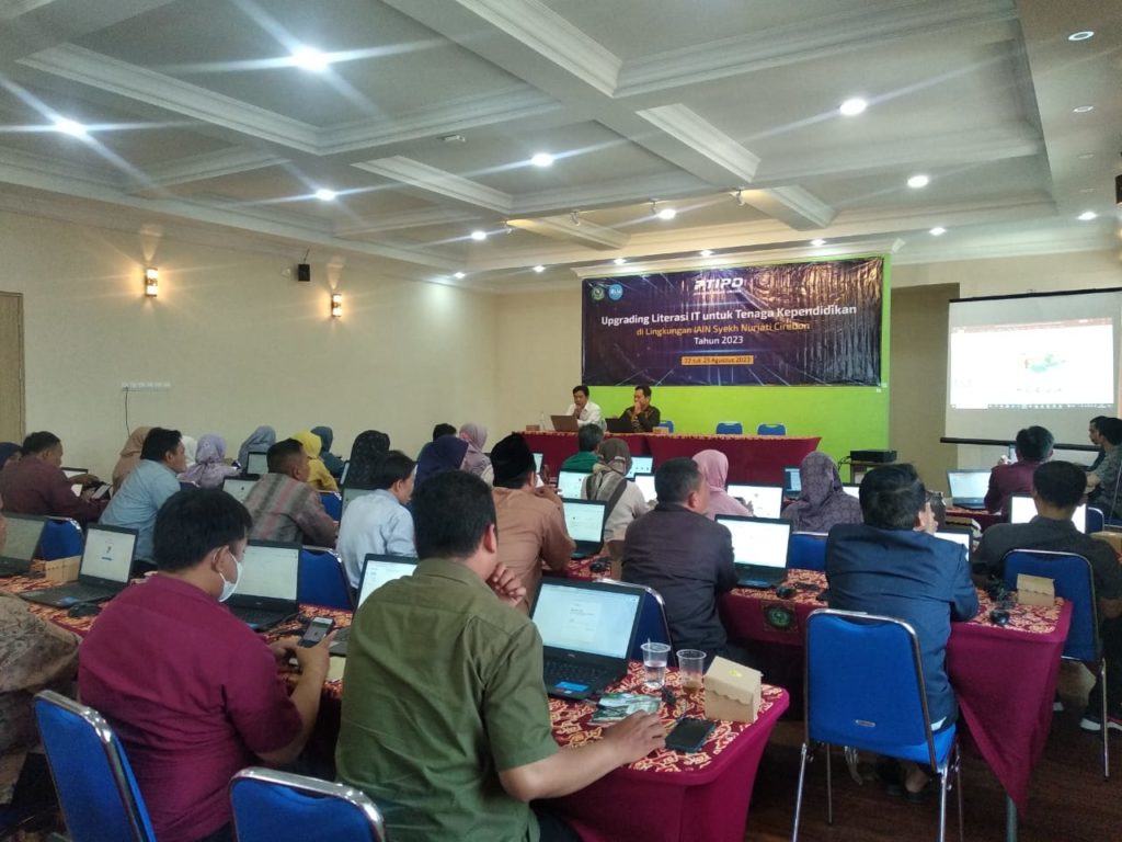 Pusat Teknologi Informasi dan Pangkalan Data (PTIPD) Institut Agama Islam Negeri (IAIN) Syekh Nurjati Cirebon menyelenggarakan kegiatan Upgrading Literasi IT untuk Tenaga Kependidikan di Lingkungan IAIN Syekh Nurjati Cirebon Tahun 2023 bertempat di auditorium LPM lantai 3 selama dua hari tanggal 22 s/d 23 Agustus 2023. Kegiatan diikuti oleh tenaga kependidikan di lingkungan IAIN Syekh Nurjati Cirebon dengan menghadirkan narasumberdihari pertama Arif Kurniawan, S.T (praktisi IT, pengurus Taman Pena.com dari Yogyakarta) dan dihari kedua oleh Dodi Solihin, M. Kom. dibantu oleh staf PTIPD IAIN Syekh Nurjati Cirebon. kegiatan tersebut bertujuan untuk upgrading literasi dibidang IT (google workspace dll), meninggkatkan kemampuan supaya lebih baik lagi guna menyongsong transformasi lembaga menjadi universitas. Selaku moderator kegiatan tersebut adalah Riyanto, M.Kom Selasa (22/08/23)
