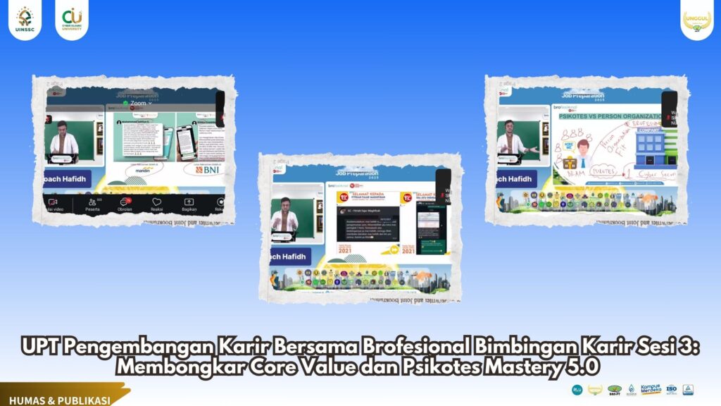 UIN Siber Cirebon – Unit Pelaksana Teknis (UPT) Pengembangan Karir kembali menggelar bimbingan karir yang inspiratif bersama Brofesional. Memasuki sesi ke-3, kegiatan kali ini berfokus pada pembahasan mendalam mengenai Core Value dan Psikotes Mastery 5.0, bersama Coach Hafidh Rifky Adiyatna, S.Si., M.B.A. sebagai Pemateri. (15/7).