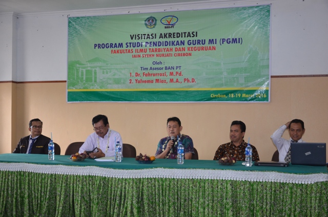Sabtu, 19 Maret 2016 Jurusan PGMI IAIN Syekh Nurjati Cirebon kedatangan Tim Assesor BAN-PT untuk melakukan kegiatan Visitasi dan Akreditasi Jurusan PGMI, menurut Ketua Jurusan PGMI Fakultas Ilmu Tarbiyah dan Keguruan Syibli Maufur, M. Pd menjelaskan bahwa untuk meningkatkan mutu kelembagaan salah satunya adalah dengan diadakannya kegiatan Visitasi dan Akreditas oleh BAN-PT guna menilai sejauh mana manfaat Jurusan PGMI baik oleh Alumni, Stakeholder maupun Pengguna. Pada kesempatan Visitasi dan Akreditasi kali ini BAN-PT mengutus Prof. Dr. Yalvema Miaz, M.A., P.h.D dan Dr. Fahrurrozi, M. Pd sebagai Assesor yang ditugaskan untuk melakukan Visitasi dan Akreditasi pada Jurusan PGMI IAIN Syekh Nurjati Cirebon Tahun 2016.