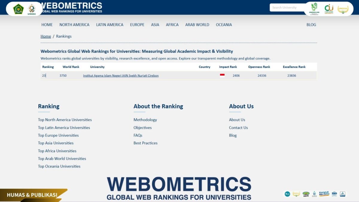 Berdasarkan data resmi Webometrics Januari 2026, UIN Siber Syekh Nurjati Cirebon tercatat berada pada peringkat 3.750 dunia, sekaligus peringkat ke-23 PTKIN terbaik Indonesia. Capaian ini sekaligus mempertegas posisi UIN Siber Syekh Nurjati Cirebon sebagai salah satu PTKIN yang konsisten mengembangkan pendidikan tinggi Islam berbasis teknologi digital.
