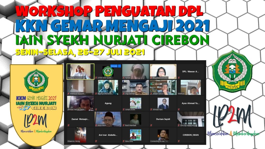 Lembaga Penelitian dan Pengabdian Kepada Masyarakat (LP2M) IAIN Syekh Nurjati Cirebon menggelar Workshop bagi calon Dosen Pembimbing Lapangan (DPL) Kuliah Kerja Nyata Gerakan Masyarakat Mengaji (KKN-GM) Tahun 2021. Kegiatan ini digelar selama dua hari, tanggal 26 – 27 Juli 2021 melalui Virtual zoom meeting dan channel Youtube LP2M IAIN Syekh Nurjati Cirebon. Kegiatan Workshop ini secara resmi dibuka oleh Kepala Pusat Pengabdian kepada Masyarakat LP2M IAIN Syekh Nurjati Cirebon, Bapak H. Mahbub Nuryadien, M.Ag. Kamis (29/07)