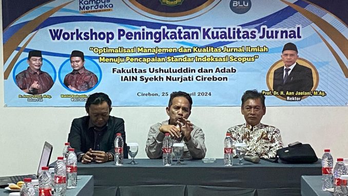Workshop dengan tema “Optimalisasi Manajemen dan Kualitas Jurnal Ilmiah Menuju Pencapaian Standar Indeksasi Scopus” dilangsungkan di Tryas Hotel pada Kamis (25/04/2024). Acara dibuka oleh Prof. Dr. H. Aan Jaelani, M.Ag., Rektor IAIN Syekh Nurjati Cirebon, yang memberikan arahan untuk meningkatkan kualitas jurnal.