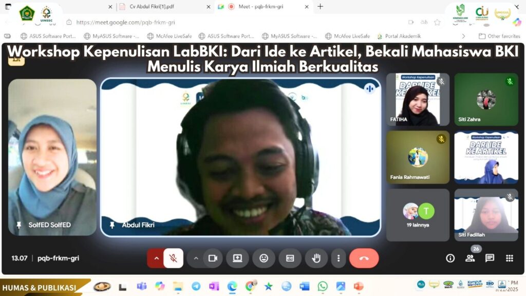 UIN Siber Cirebon – Laboratorium Bimbingan Konseling Islam (LabBKI) UIN Siber Syekh Nurjati Cirebon melalui Divisi Penelitian dan Publikasi menggelar Workshop Kepenulisan bertajuk “Dari Ide ke Artikel: Panduan Praktis Menulis Karya Ilmiah yang Komprehensif” secara daring via Google Meet, Minggu (21/9), pukul 13.00–15.00 WIB.