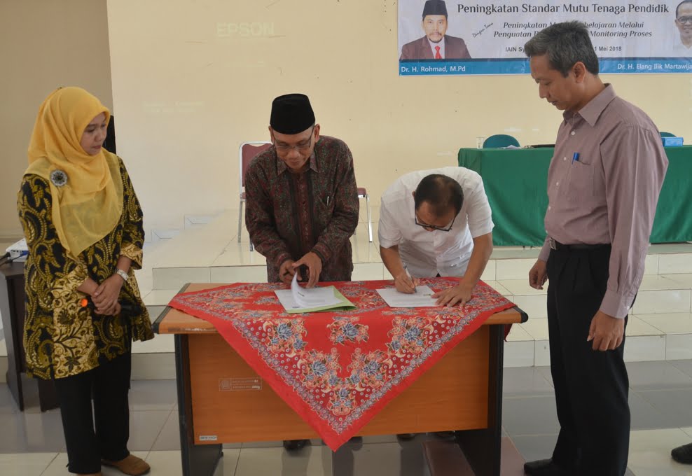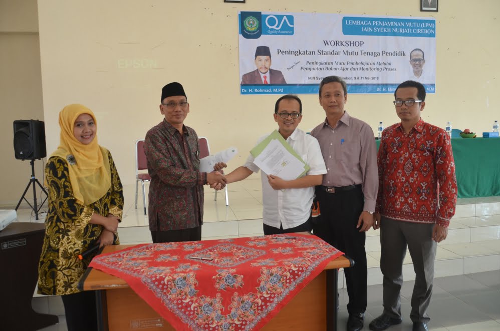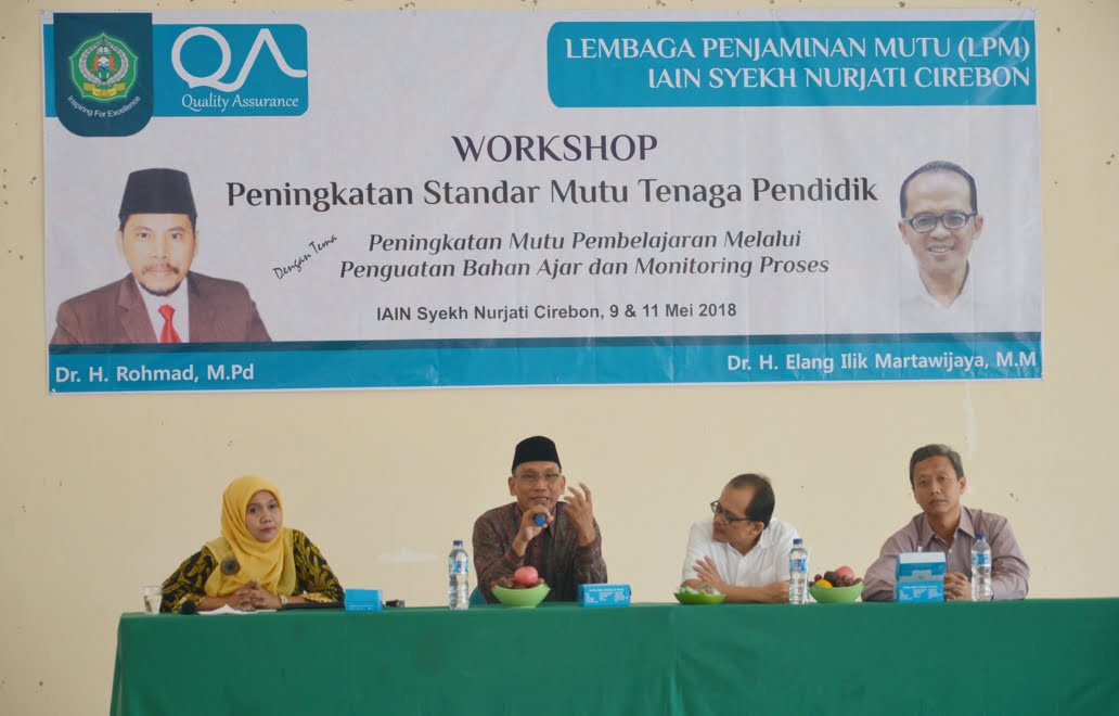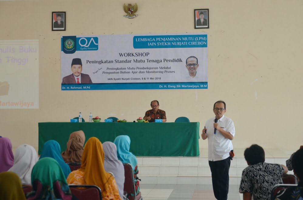 Lembaga Penjamin Mutu (LPM) IAIN Syekh Nurjati Cirebon menggelar kegiatan Workshop Peningkatan Standar Mutu Tenaga Pendidik dengan tema kegiatan “Peningkatan Mutu Pembelajaran Melalui Peningkatan Bahan Ajar dan Monitoring Prosess” di Aula gedung Pascasarjana lantai 3. Kegiatan tersebut dihadiri oleh tamu undangan Dr. H. Elang Ilik Martawijaya, M.M. (Narasumber). Dr. H. Rahmat, M.Pd. dan peserta yang hadir dalam kegiatan tersebut sekitar 200 peserta. Tujuan diadakan kegiatan tersebut adalah agar dosen-dosen di lingkungan IAIN Syekh Nurjati Cirebon dapat mengembangkan bahan ajar yang terpublikasikan di penerbit yang menjadi anggota Assosiasi Penerbit Perguruan Tinggi Indonesia (APPRI) dan agar dosen-dosen mampu membentuk soal-soal evaluasi pembelajaran yang sesuai dan terstrandar. Rabu (09/11-05-18).