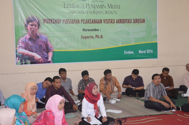 Lembaga Penjaminan Mutu (LPM) IAIN Syekh Nurjati Cirebon pada Hari Selasa, 15 Maret 2016 menggelar acara Workshop Persiapan Pelaksanaan Visitasi Akreditasi Jurusan dilingkungan IAIN Syekh Nurjati Cirebon Tahun 2016. Dr. Septi Gumiandari, M. Ag menghadirkan SUPARTO, Ph.D sebagai Narasumber pada kegiatan kali ini. Workshop ini bertujuan agar semua unit kegiatan khususnya semua Jurusan dilingkungan IAIN Syekh Nurjati Cirebon untuk meningkatkan mutu pelayanan, pembelajaran dan kualitas akademik, guna peningkatan mutu kelembagaan yang bergerak di bidang pendidikan tinggi khususnya IAIN Syekh Nurjati Cirebon.